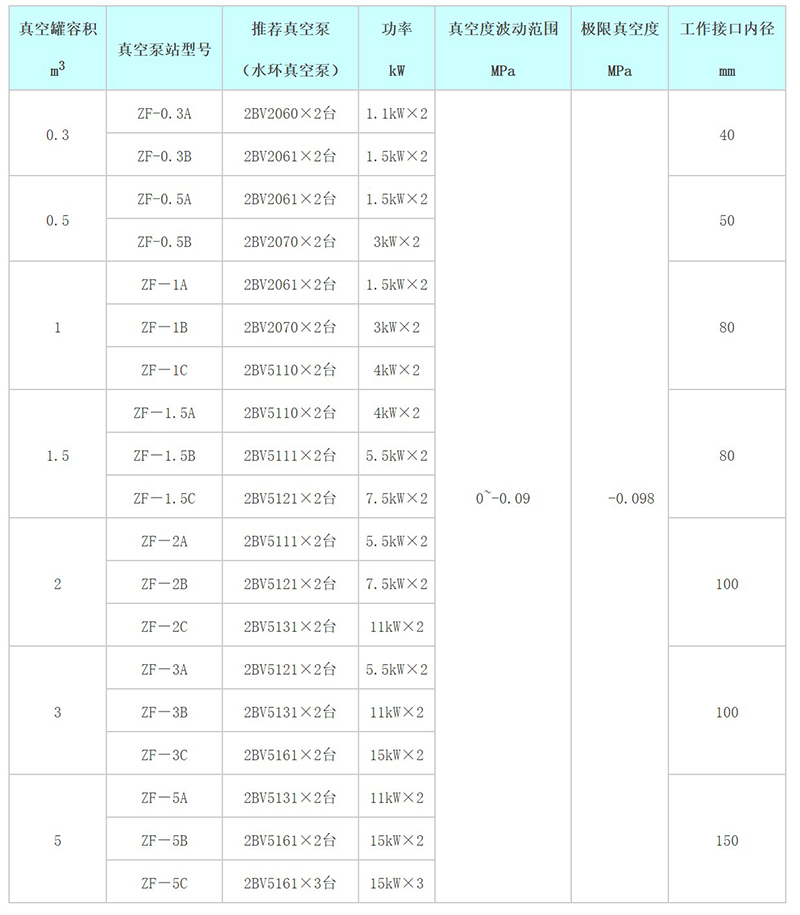 ZF系列真空泵站性能參數(shù)